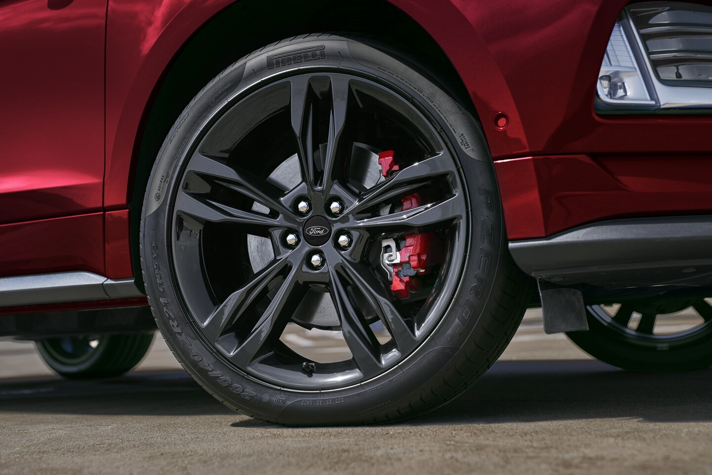 21-inch premium gloss black-painted aluminum wheels, showing the available painted Colorado Red brake calipers.